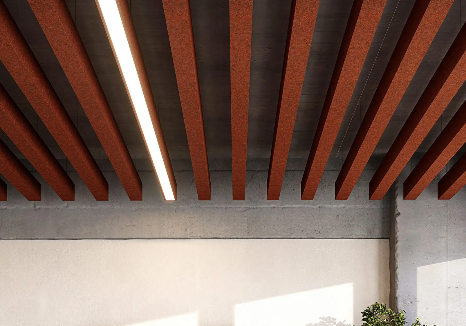 Popular Truss ceiling baffles with integrated LED lighting produce a lean, aerodynamic look. Diffused LED lighting channels embedded in the Premier Collection’s sound absorbing baffles reduce noise while efficiently illuminating the space. Acoufelt’s advanced manufacturing technology gives you the latitude to specify a standard lighting option or embed your own lighting components.