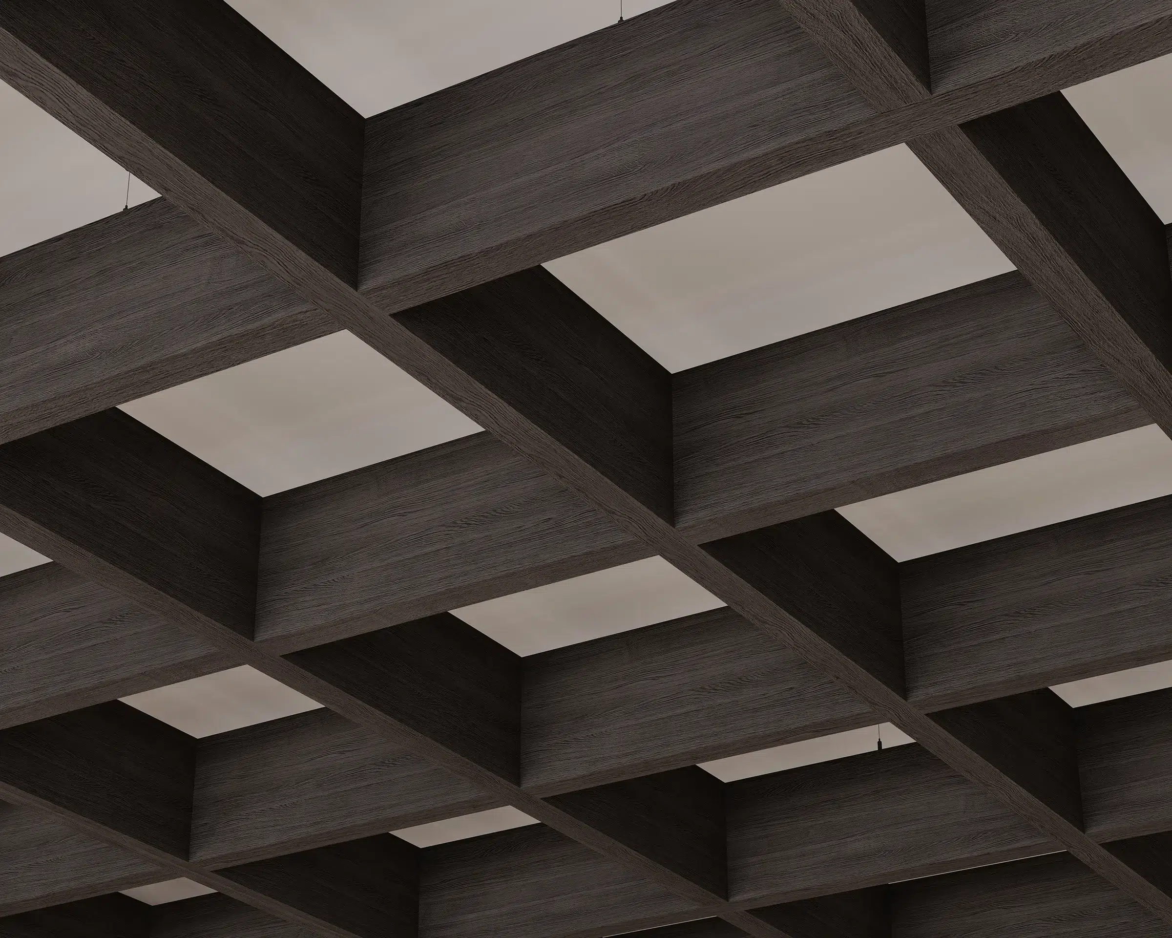 The Framework design provides a cushion of quiet while keeping the aesthetic of an open ceiling within any environment while working seamlessly around other ceiling components such as sprinklers, speakers, and lighting. Available in WoodGrain Collection that perfectly mimics real timber without the weight and heavy cost of natural wood.