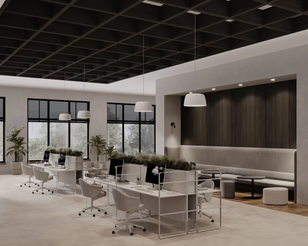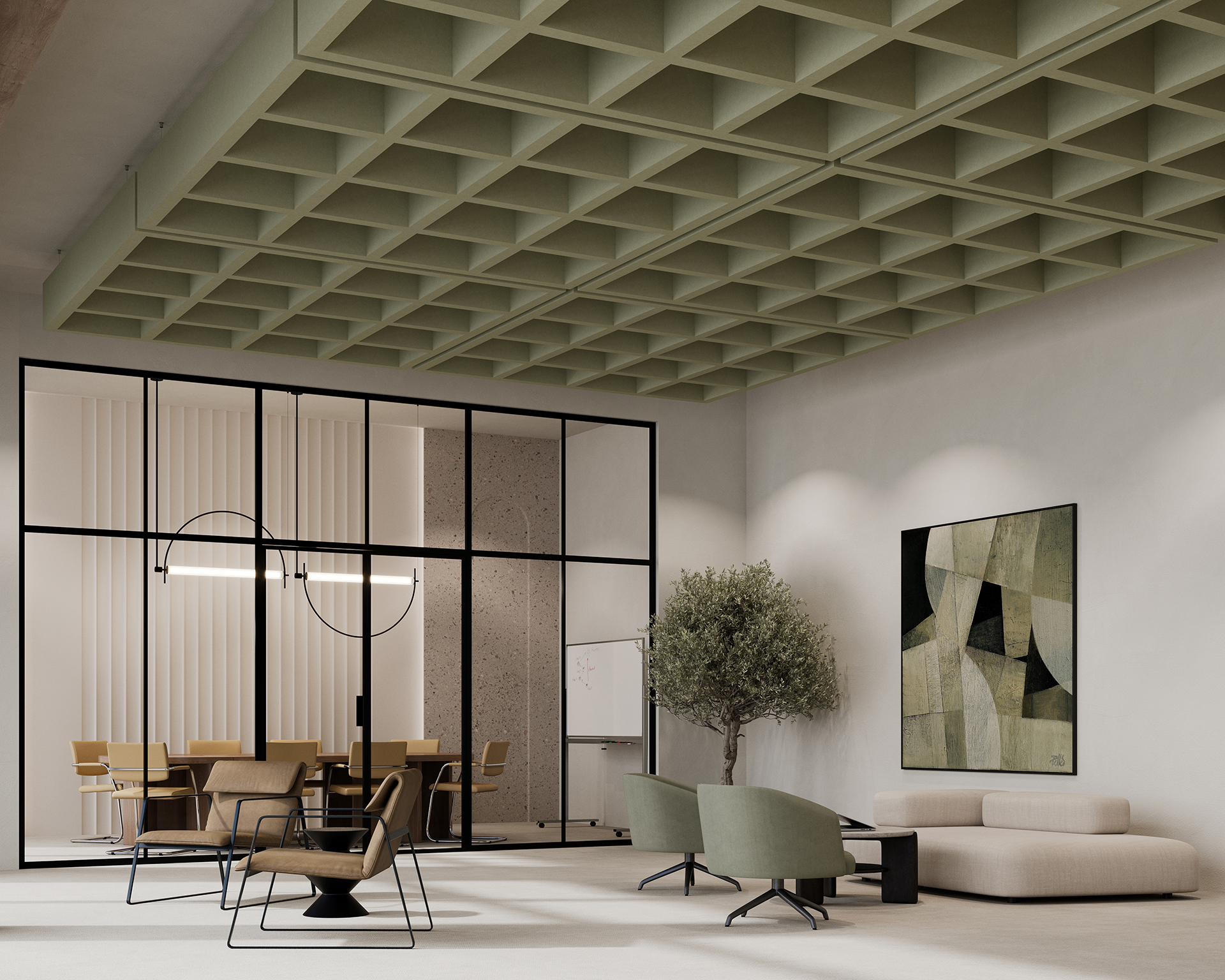 The Framework design provides a cushion of quiet while keeping the aesthetic of an open ceiling within any environment while working seamlessly around other ceiling components such as sprinklers, speakers, and lighting.